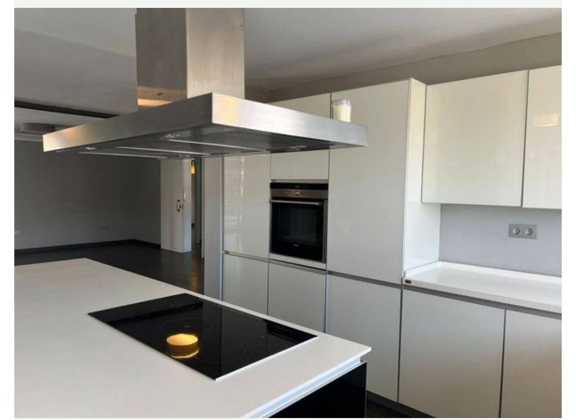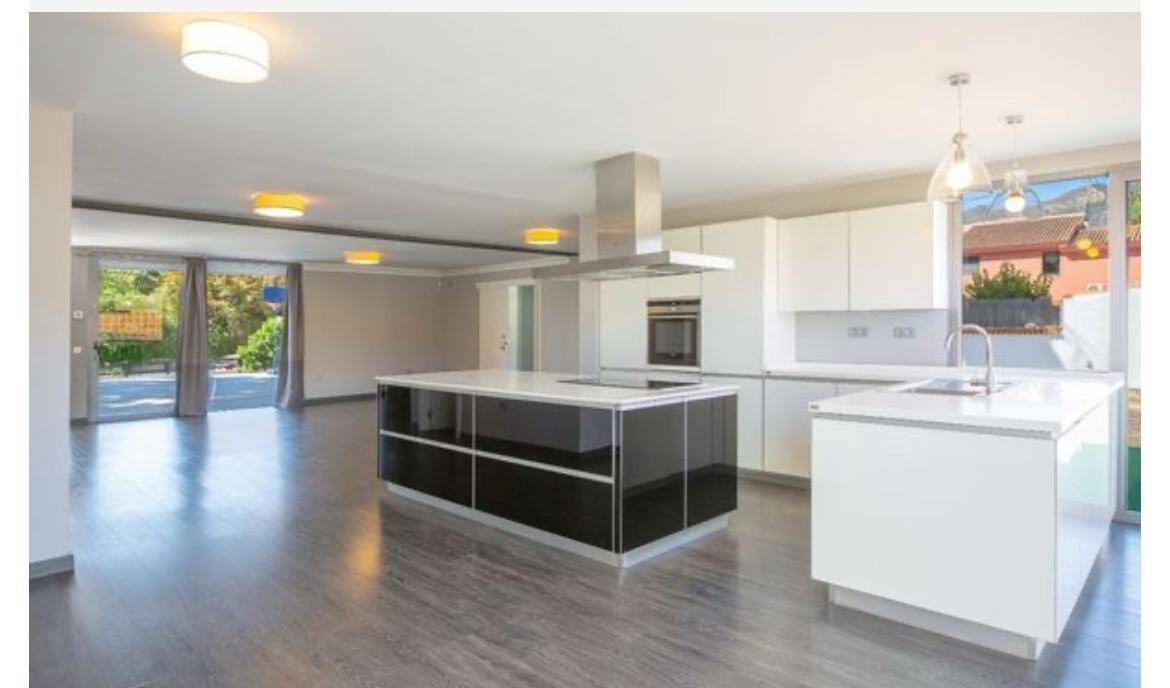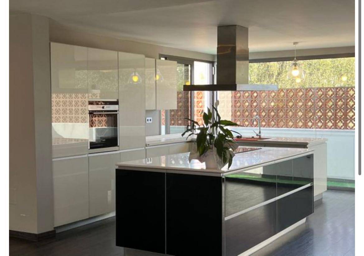 - Cocina de alta gama, equipada con grandes ventanales que conectan con el jardín, creando un ambiente luminoso y acogedor.
