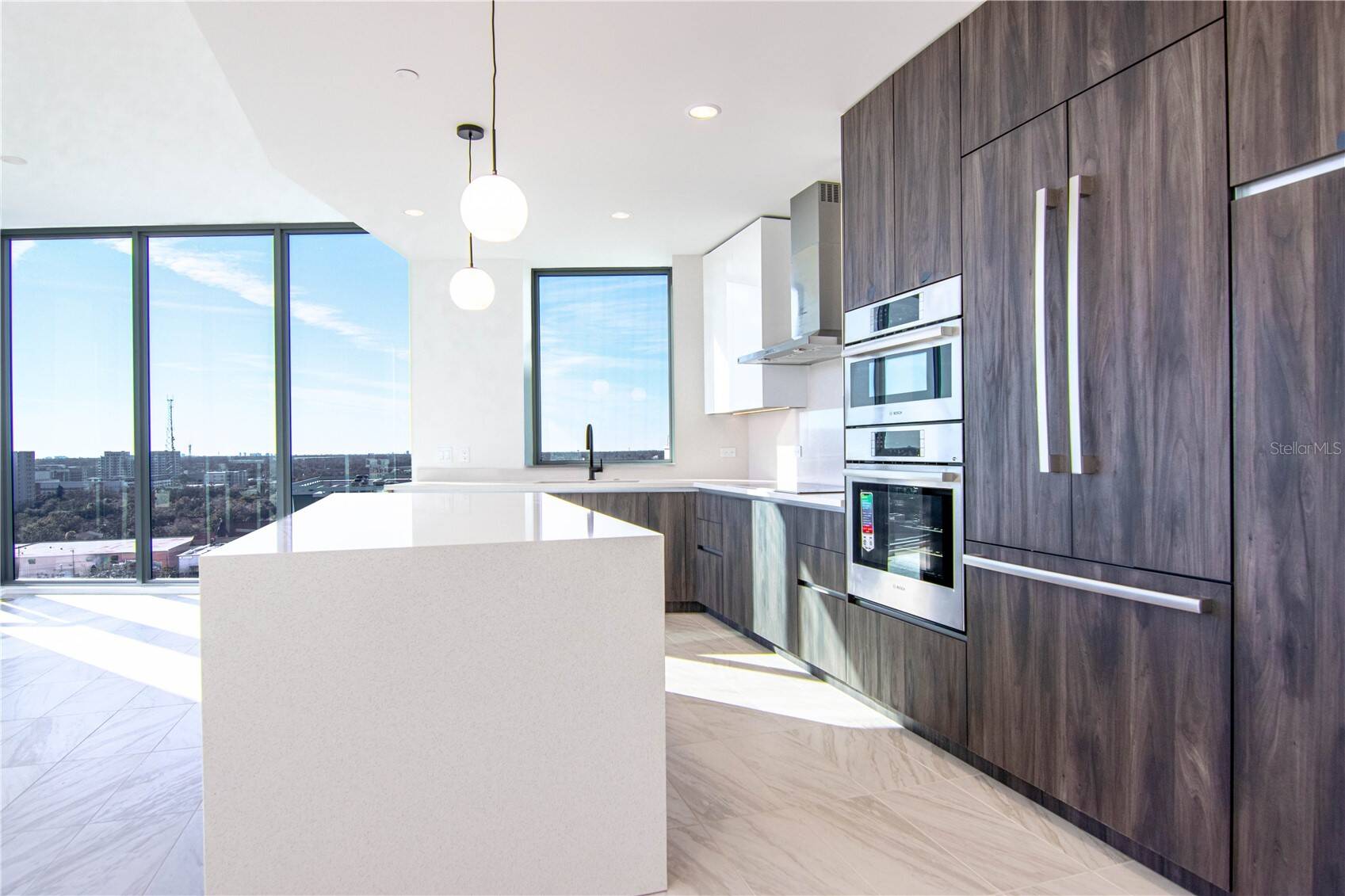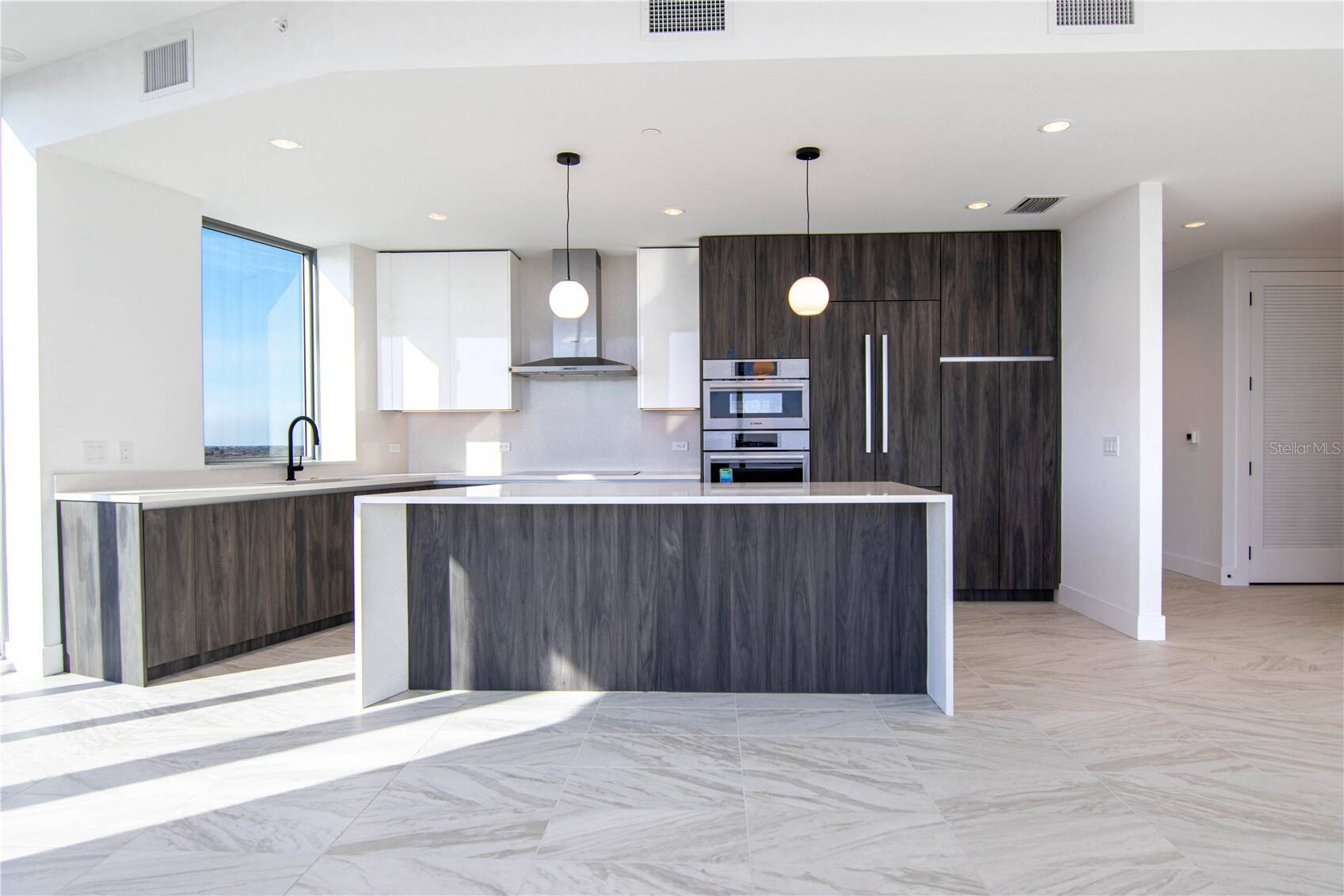 Esta casa está equipada con una moderna cocina de chef que incluye encimeras de cuarzo, una isla de gran tamaño con borde de cascada y electrodomésticos de acero inoxidable Bosch de alta gama, empotrados y listos para paneles de gabinete.